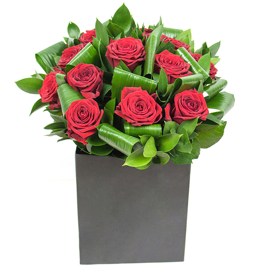 Embrace the beauty and uniqueness of our bouquet, featuring stunning red roses paired with lush aspidistra leaves and elegant ruscus. This arrangement adds a touch of elegance to any setting.
