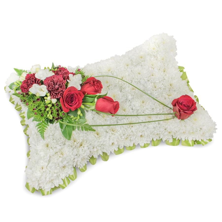 Convey your deepest sympathies with our heartwarming arrangement, featuring a beautiful combination of white chrysanthemums, red roses, white freesias, and dark red carnations. Completed with delicate dianthus and graceful bear grass, this bouquet offers a touching expression of care and remembrance.